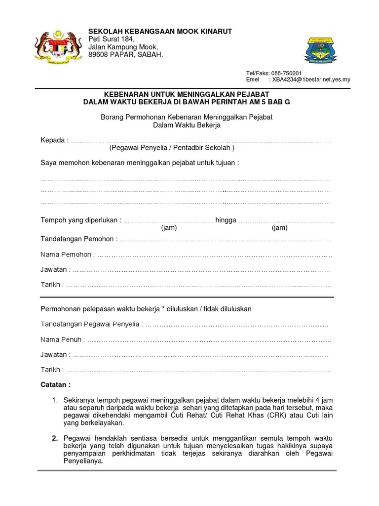 Borang Kebenaran Keluar Pejabat from imgv2-1-f.scribdassets.com Sekiranya tempoh pegawai meninggalkan pejabat dalam waktu bekerja melebihi 4 jam atau separuh daripada waktu bekerja sehari yang ditetapkan pada hari tersebut, maka pegawai dikehendaki mengambil cuti rehat. Ketua pengarah jabatan pembangunan kemahiran (jpk) kementerian sumber manusia tuan, pengesahan pengalaman dan kebenaran untuk terlibat sebagai personel penilaian dan verifikasi (ppv) jabatan pembangunan kemahiran (jpk). Borang permohonan kebenaran meninggalkan pejabat dalam waktu bekerja sekiranya tempoh pegawai meninggalkan pejabat dalam waktu bekerja melebihi 4 jam atau separuh daripada waktu bekerja sehari yang ditetapkan pada hari tersebut. Bagi borang kebenaran pada pihak perempuan. Borang permohonan cuti rehat kebenaran meninggalkan pejabat dalam waktu bekerja di bawah perintah am orang permohonan emel rasmi perak perkhidmatan emel pentadbiran awam negeri perak. Kebenaran dari pihak imigresen negara pengajian (jika berkenaan). Berikan alasan yang jelas sebab permohonan pergerakan. Pemohon perempuan boleh mendapatkan kebenaran berkahwin dari pejabat agama islam daerah (paid) selepas pemohon lelaki mendapat kebenaran berkahwin.