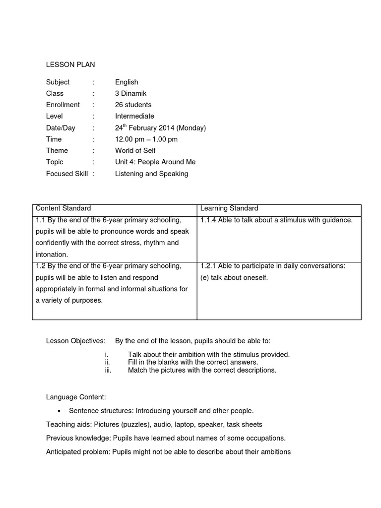 Listening and speaking theme world of knowledge topic a ride in the safari park content standard 1.1 learning 1.1.4 standard learning by the end of the lesson, pupils should be able to: Sentence types english year 5/6 unit/lesson focus: Theme:world of knowledge topic:occupations focuslistening and speaking learning standards: 1.1.4, 1.2.1, 3.2.3 learning objectives… example of the lesson plan for year 1, 2, 3. Year 3 english lesson plans.