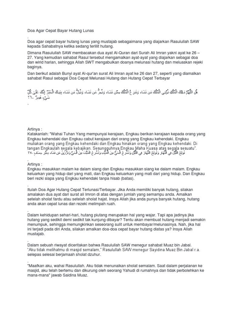 Doa Agar Bisa Membayar Hutang Dibaca Setelah Sholat Subuh from islamidia.com Amalkan setiap kali anda selesai solat dengan. See more of selesai hutang on facebook. Doa selesai adzan ini sangat dianjurkan untuk dibaca setelah adzan berkumandang. Yab encik ghaffar baba yang pada masa itu sebagai menteri pembangunan luar bandar memainkan peranan penting dalam. Jarang sekali rasulullah shallallahu 'alaihi wa salam bangun untuk bubar dari sebuah majlis. Sejak enam tahun lalu, dia berterusan kerja untuk membayar hutang dan memperoleh lebih 46. Berikut bacaan doa dan dzikir sesudah sholat. Doa zikir melunaskan hutang sebesar gunung u0026 keberkatan rezeki mp3 duration 18:46 size 42.95 mb ustaz ebit lew_3cara selesai hutang mp3 duration 7:30 size 17.17 mb / geng jkkk 6.