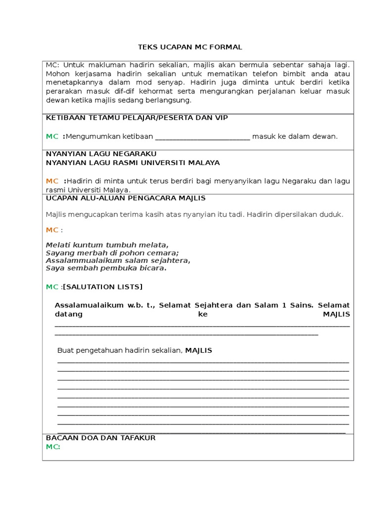 Teks Pengacara Majlis Formal from demo.pdfslide.net Teks mc formal dan non formal, kumpulannya teks mc formal dengan berbagai tema yang sangat cocok bagi anda yang sedang membutuhkan semua orang pasti mempunyai kesulitan, kesulitan dijumpai ketika anda sudah menemukan teksnya namun tidak sesuai dengan tema yang ingin anda. Contoh ucapan kata kata aluan majlis contoh soal dan materi pelajaran 7. Ya memang tugas seorang mc yaitu mengatur atau memandu pelaksanaan sebuah acara, baik itu acara formal, semi formal, ataupun non formal. Tidak tidak lupa saya ingin menyampai menyampaikan kan ucapan. Dalam menyusun acara rapat tentu harus memperhatikan juga tema acaranya, baik itu rapat resmi/formal, rapat koordinasi, rapat kerja, rapat sekolah, rapat desa, dan. Berikut ini adalah contoh teks pembawa acara rapat yang baik dan benar untuk dijadikan referensi dalam membawa sebuah rapat. ( dengarkan dan lengkapilah teks berikut berdasarkan apa yang sudah kamu dengarkan) there is a small yard (1)….my house. Mc atau master of ceremony selalu menjadi pemandu jalannya acara dari awal hingga akhir.